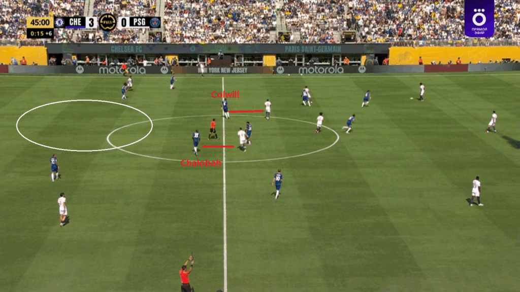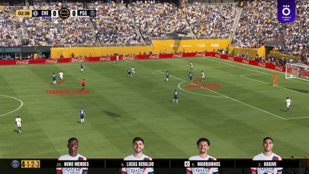 Mucho se ha escrito de la gran movilidad del PSG de Luis Enrique en la fase con balón. La respuesta de Enzo Maresca fue, aparte de atrevida y de mucho desgaste -tanto físico como de concentración-, fue original. No por los emparejamientos individuales, sino por llevarlo hasta las últimas consecuencias. Maresca entendía que en los momentos de reinicio aquel que hiciese de mediocentro del PSG sería cosa de Reece James, al igual que quien partiese como interior izquierdo sería perseguido por un central (Chalobah al principio, luego también Colwill).