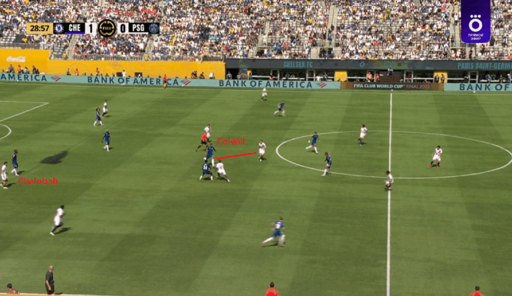 Esto de por sí, no es una novedad. El propio PSG hacía saltar a Marquinhos con Enzo (enganche), por ejemplo, en las recepciones abajo en salida. Sin embargo, el conjunto blue asumió estas largas persecuciones a todos los efectos. Por ejemplo, si Doué se movía hacia dentro o atrás, le seguía Cucurella. Esto era compensado por el movimiento contrario por Neto, que acabó actuando como un lateral izquierdo en una línea de cinco en bloque bajo. Así, si el interior izquierdo y también el delantero centro parisino (Dembélé) caían en apoyo a campo propio, la pareja de centrales (Colwill-Chalobah) llegaría a campo rival y se las podría ver por delante de la última línea.
