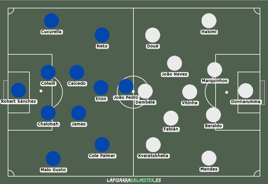 Aunque esto fuese un error momentáneo, uno se hace a la idea de que era muy importante para Maresca que al PSG le costase instalarse en campo rival de forma sencilla y que no encontrase superioridades por dentro. Y a pesar de algunos errores en algún cambio de marca (más frecuentes en el bloque medio en 5-2-3) o por algún momento de destensión puntual (la banda derecha con Malo Gusto-Cole Palmer era más propicia para el PSG por esta razón), el riesgo de estos movimientos compensó en los primeros minutos. Pronto los parisinos acuciaron la incomodidad y cuando parecía que empezaban a sacudirse la sensación, llegaron los goles. Y si la actitud londinense siempre fue óptima, con resultado a favor aumentó la confianza en el plan y las energías se mantuvieron.
