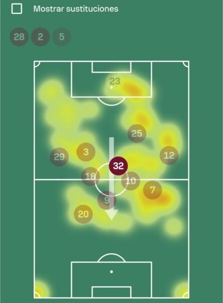 De 39 pases que intentó Potts, tan sólo falló en seis de ellos. Y como vemos gracias a las flechas, varios envíos no eran simples pases de apoyo en corto. Un dato que habla muy bien del manejo de Potts con balón y con ello, el West Ham se pudo apoyar bastante en su figura para tener momentos de control.