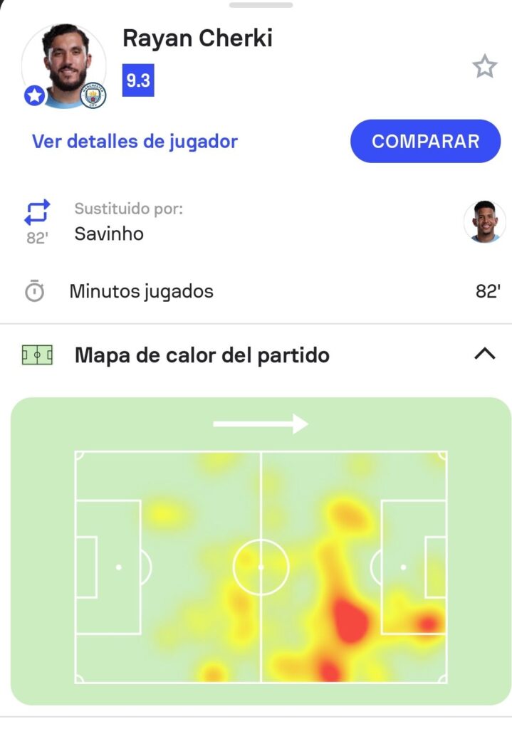 Rayan Cherki jugó inicialmente en la zona derecha, pero su influencia fue más allá, multiplicándose por diversos lugares del campo y haciendo muchísimo daño por el carril central-derecho. Ahí es donde dejó su sello e hizo de conector para Phil Foden y Erling Haaland.
