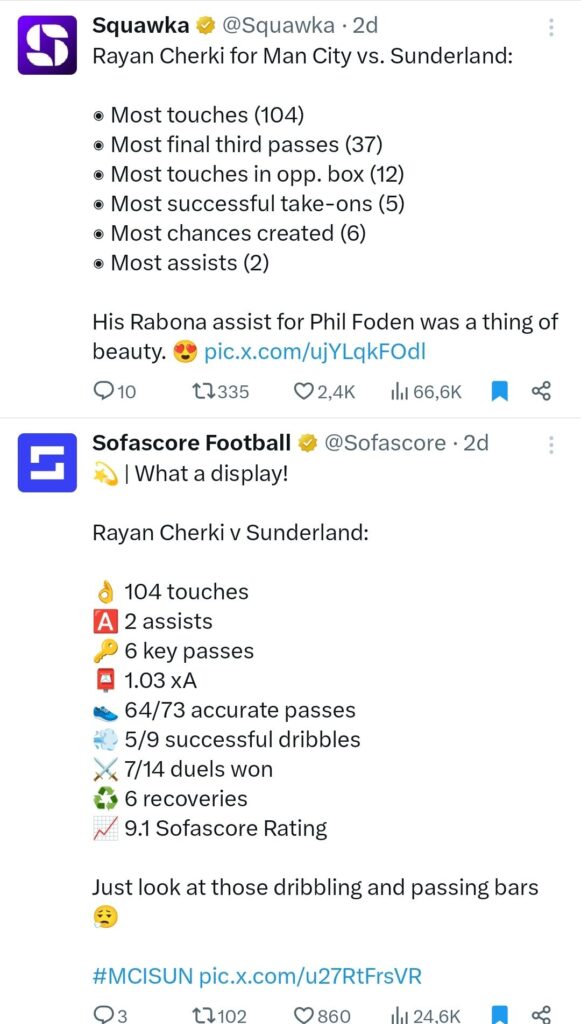 Las estadísticas se pueden ver reflejadas en este vídeo de acciones de Rayan Cherki ante el Sunderland. Ahí vemos la cantidad de acciones peligrosas que produce, todo por el bien de su equipo y sin mirar por el individualismo. Acabó con dos asistencias, y poco fue para lo que pudo ser.