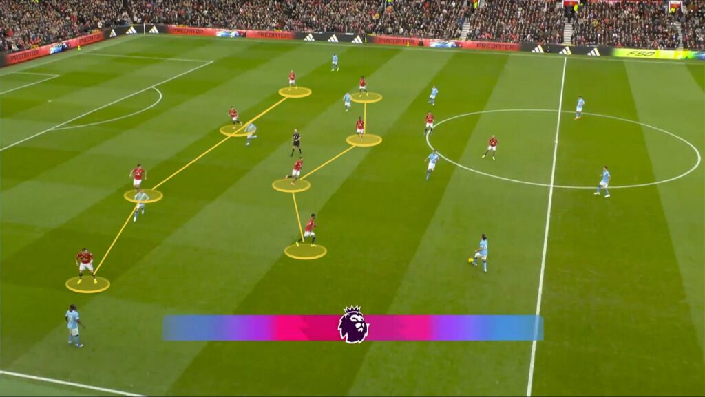 Michael Carrick buscó la compacidad por dentro con dos puntas liderando la presión y una línea de cuatro por detrás. El Manchester United se aseguraba de que los centrocampistas centrales del City estuvieran marcados, y una vez el balón llegaba a las bandas, presionaban rápidamente a unos extremos que por ello, comenzaron a replegarse hacia el centro explorando opciones, pero ahí es donde aparecía Casemiro barriendo. Luego, la pareja de centrales formada por Maguire y Lisandro estuvo impecable, al igual que un Luke Shaw que en el lateral izquierdo fue difícil de superar y facilitó líneas de pase al equipo.