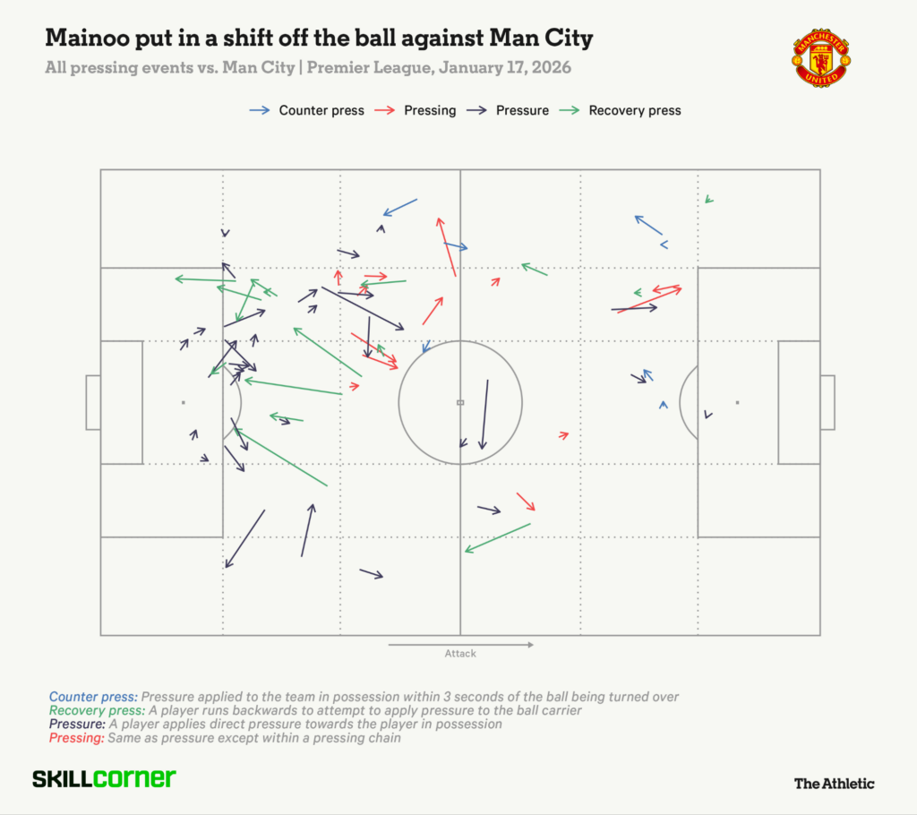 Otro que brilló fue Kobbie Mainoo, quien con la inestimable ayuda de un gran Casemiro, pudo ayudar al avance y aparte, defensivamente aportó mucho. Jugador que fue clave tapando líneas de pase hacia Foden, evadiendo presiones y en la presión al rival.