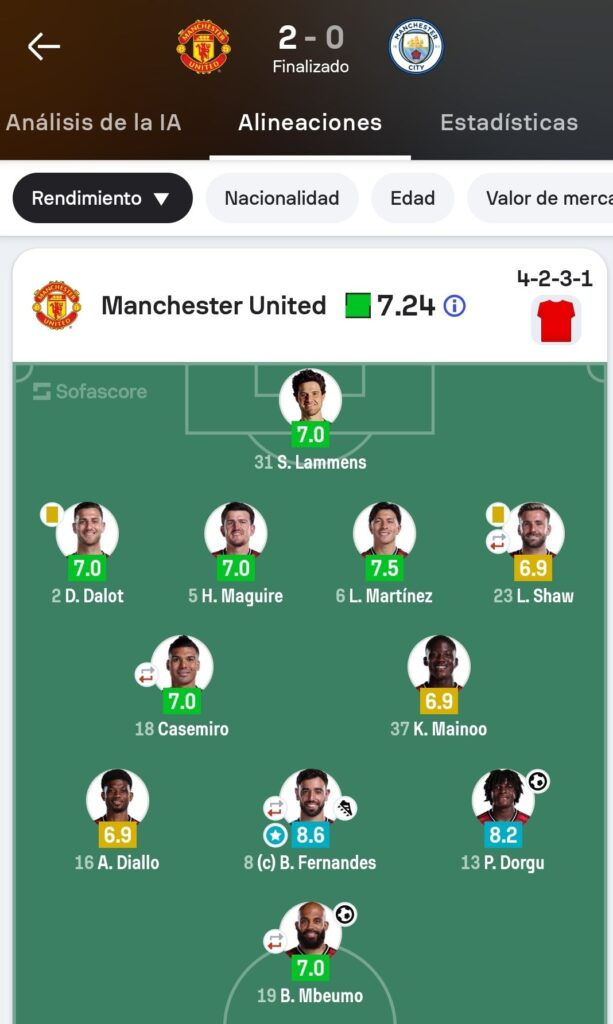 La repartición de espacios a los jugadores por parte de Michael Carrick fue excelente. El único futbolista que quedó «desplazado» fue Dorgu, quien hizo de extremo izquierdo pero eso sí, cuajó un gran papel. En ataque fue también vital Mbeumo con sus movimientos (gol incluido), un incisivo Amad Diallo y la buena entrada de Matheus Cunha desde el banquillo, quien incluso asistió a Dorgu en el 2-0.