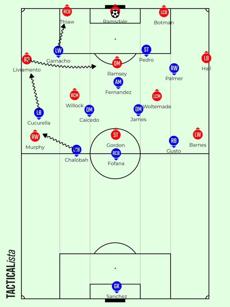 Jacob Ramsey y Joe Willock, acompañados por un Nick Woltemade que hacía de interior, fueron quienes conformaron el centro del campo del Newcastle. El alemán tuvo la tarea de marcar al mediocampista más retrasado del Chelsea durante la mayor parte del tiempo que estuvo en el campo, mientras que Ramsey y Willock adaptaron su presión según la situación.