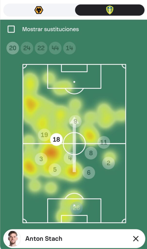 Como podemos observar, Anton Stach fue el centrocampista más adelantado del Leeds, gracias a la libertad que le pudo otorgar Ethan Ampadu (4) y al trabajo de un Sean Longstaff (8) que estaba pendiente de otras tareas. También vemos que Stach se movió por todo el campo, con especial influencia en el sector izquierdo y teniendo más presencia en una zona más atrasada.